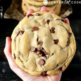 These Giant Chocolate Chip Cookies are everything a bakery cookie should be: thick, soft, buttery and packed with chocolate chips. If you are some that thinks bigger cookies are better cookies, this recipe is for you!