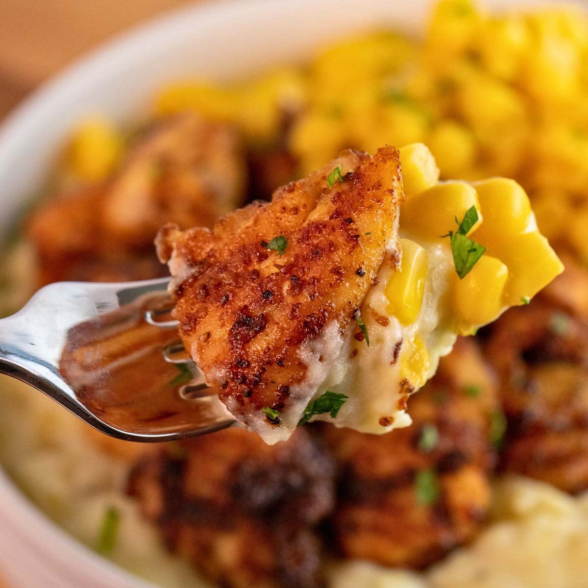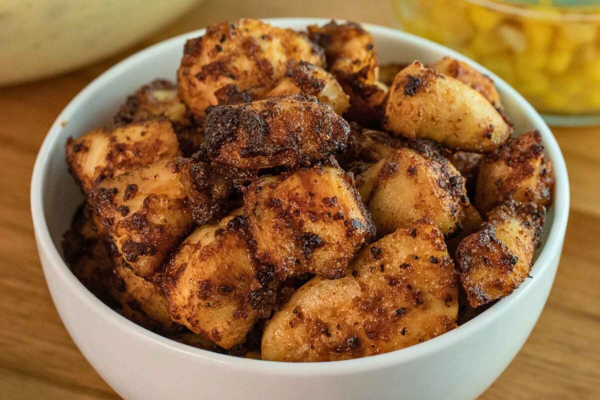 This chicken bites recipe made in the air fryer is truly a weeknight wonder. You’ll come back to this recipe over and over because not only are you going to enjoy these juicy little bites and how easy they are to make, but your kids will too. Looking for a warm, comforting, inviting meal? Use these chicken bites to make chicken bowls with mashed potatoes and corn.