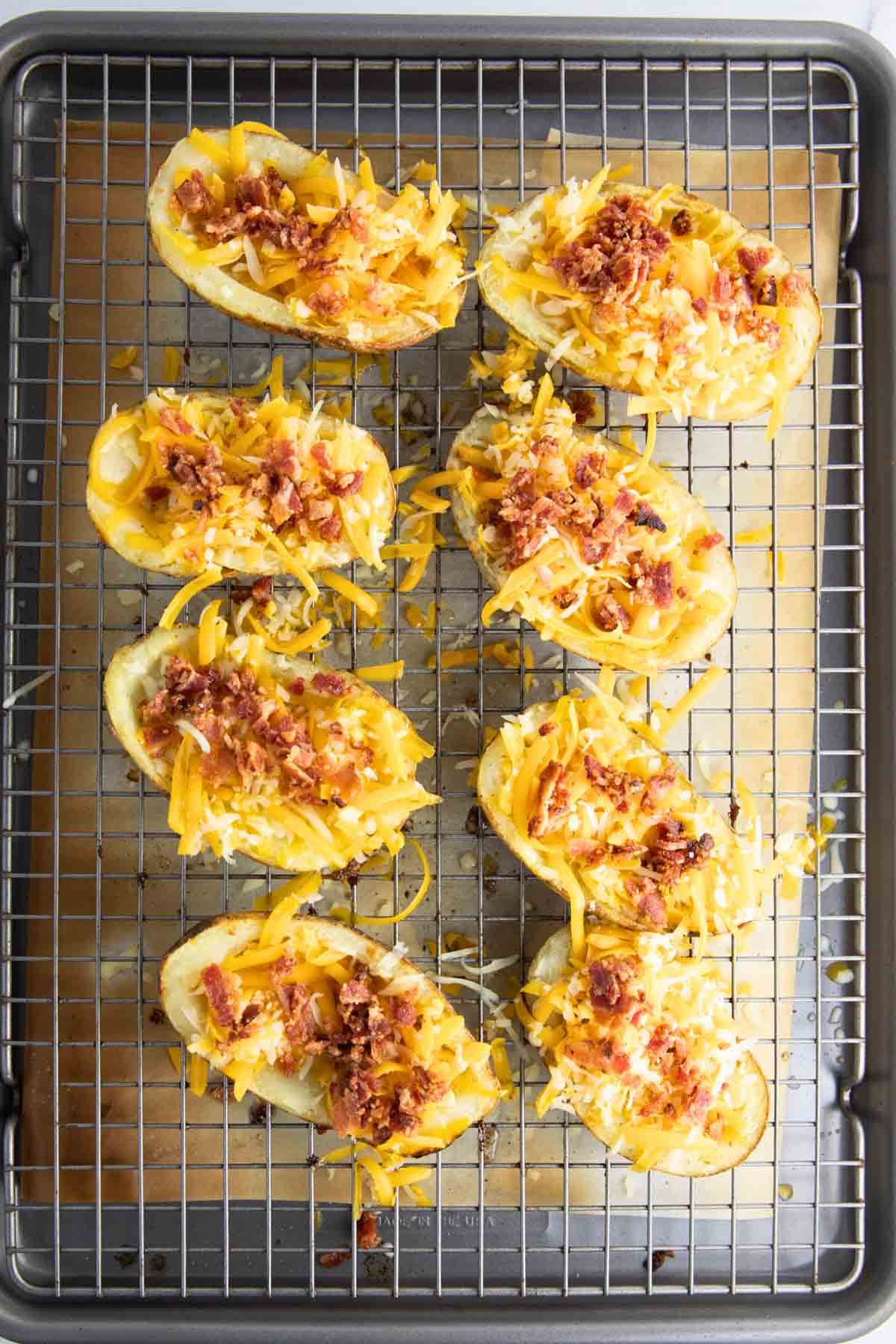 - Add toppings: Remove skins, top with shredded cheddar and crumbled bacon and broil for another 2-4 minutes until the cheese melts.